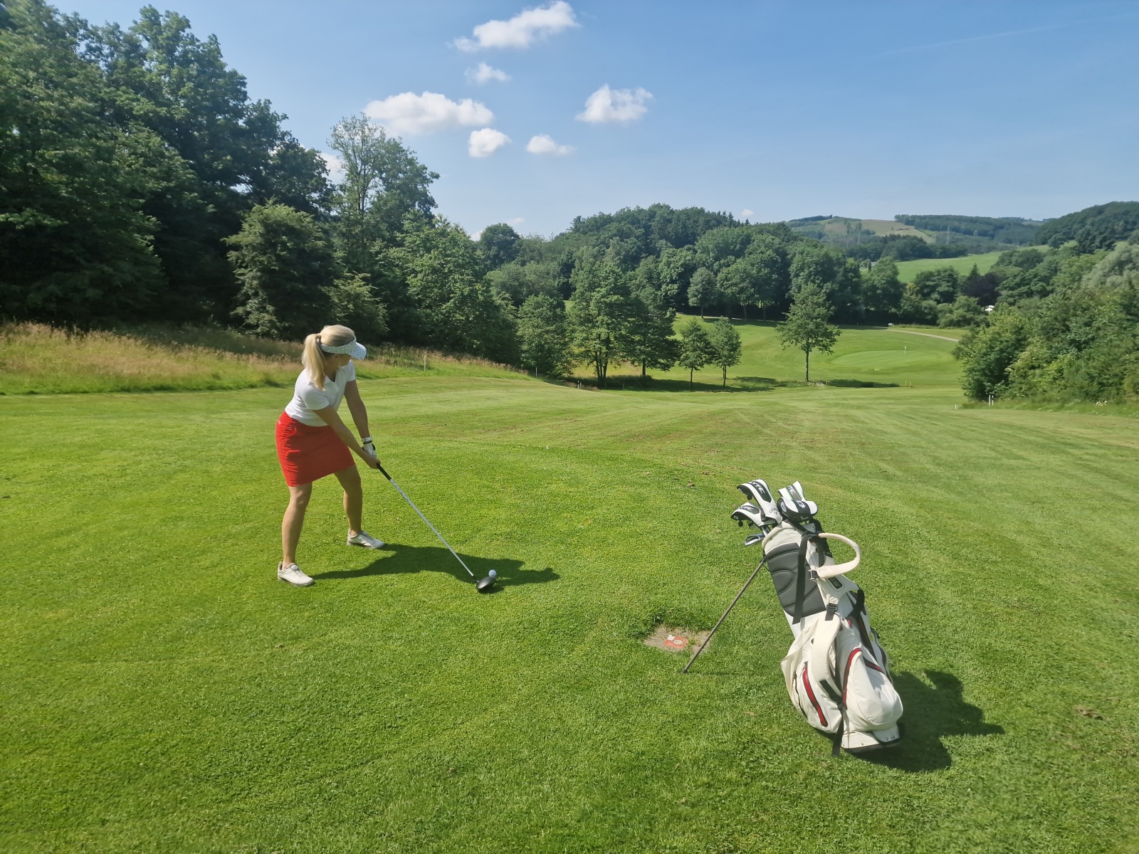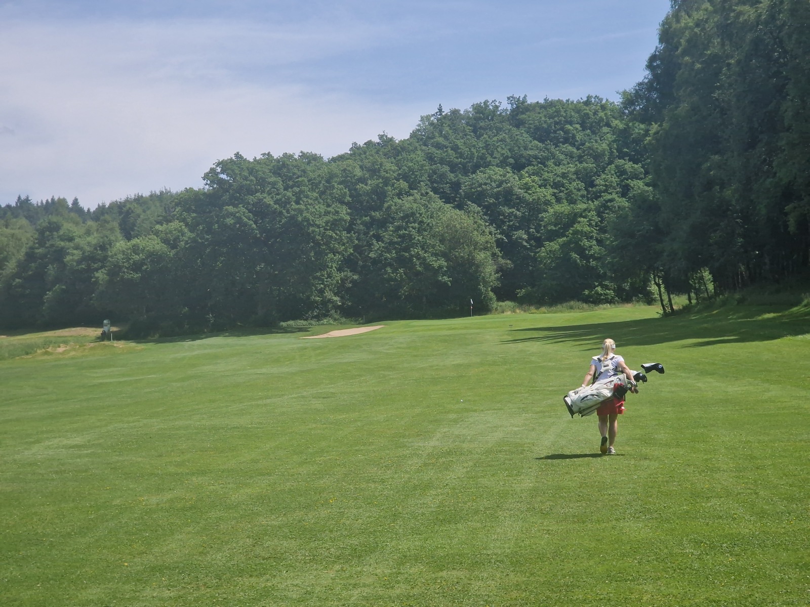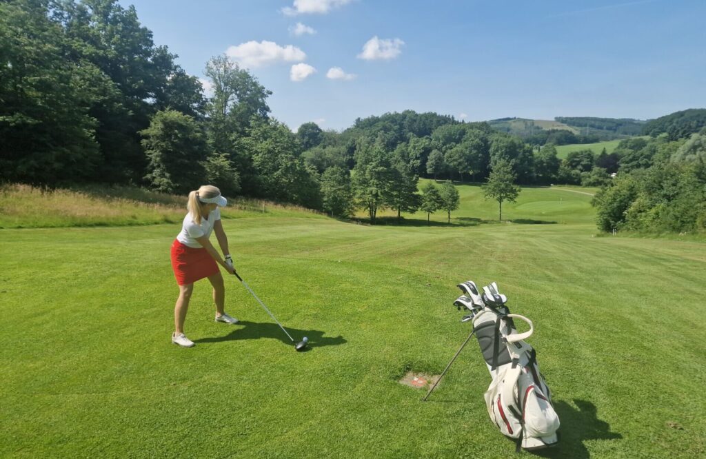 Landschaft & Anlage: Der Kurs zieht sich durch eine wunderschöne, leicht hügelige Natur mit weiten Blicken über Wiesen, Waldränder und Talsenken. Er wirkt großzügig und weitläufig angelegt – Bahnen haben Raum zu atmen; selbst an belebten Tagen verteilt sich das Spiel angenehm.